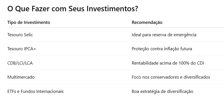 Com inflação fora da meta e juros altos até 2027, é fundamental diversificar seus investimentos, manter reservas de emergência bem alocadas e acompanhar de perto o cenário econômico.